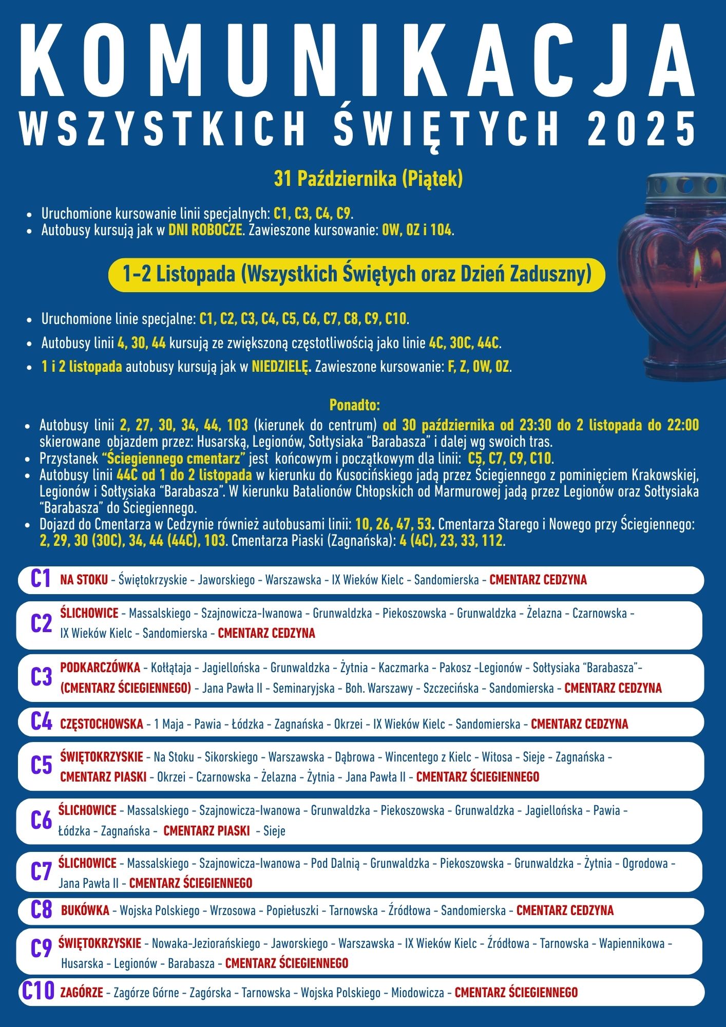 W okresie Wszystkich Świętych komunikacja miejska zostaje wzmocniona o dodatkowych dziesięć specjalnych linii C1, C2, C3, C4, C5, C6, C7, C8, C9 i C10 oraz trzech linii dodatkowych 4C, 30C, 44C
