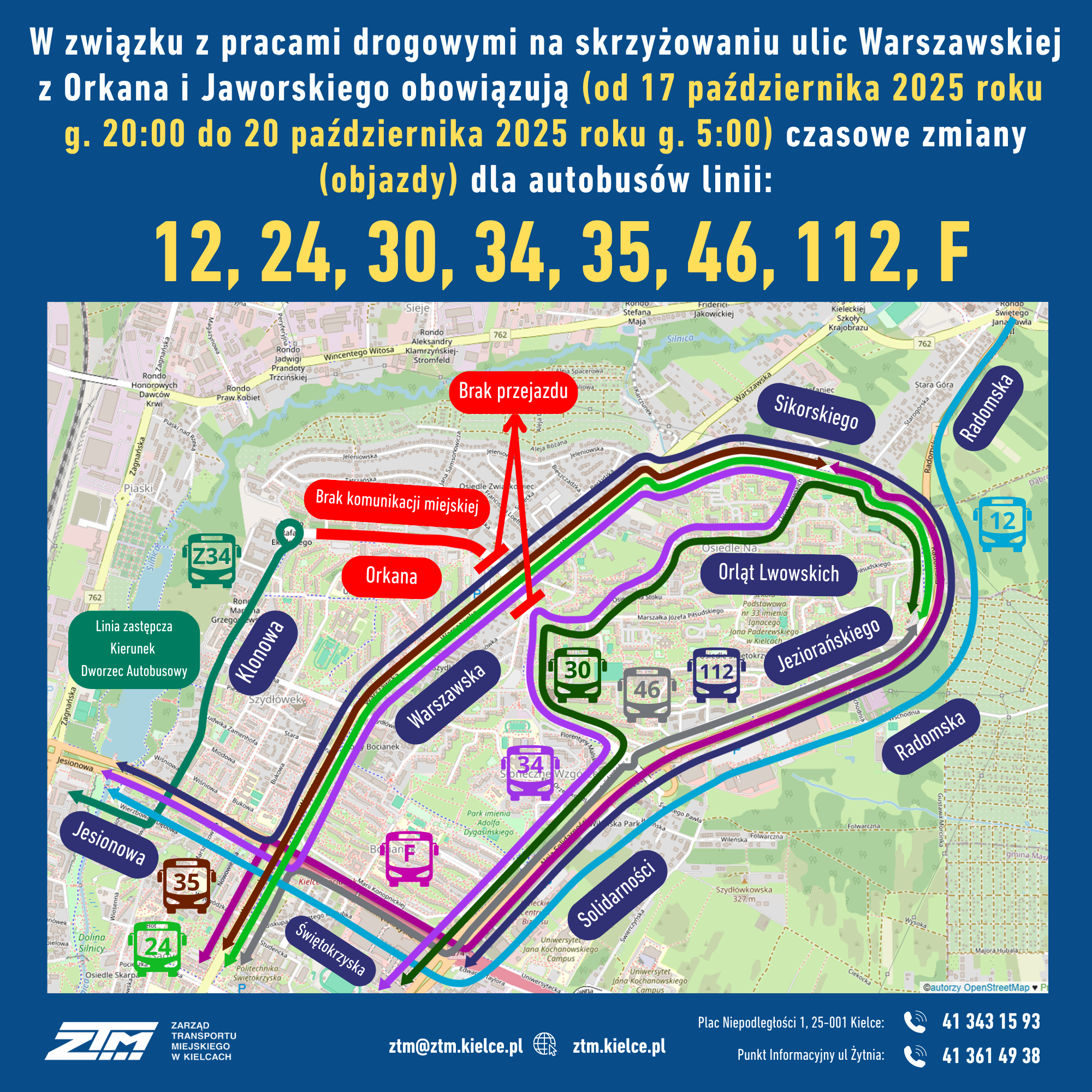 Informujemy, że od poniedziałku 13 października do piątku 17 października 2025 roku wystąpią czasowe utrudnienia w przejeździe przez skrzyżowanie Warszawskiej z Orkana i Jaworskiego. Powodem są prace drogowe związane z regulacją urządzeń podziemnych. Utrudnienia mogą mieć wpływ na punktualność realizowanych kursów autobusów linii: 7, 12, 24, 34, 35, 46, 103, N1 i N2.