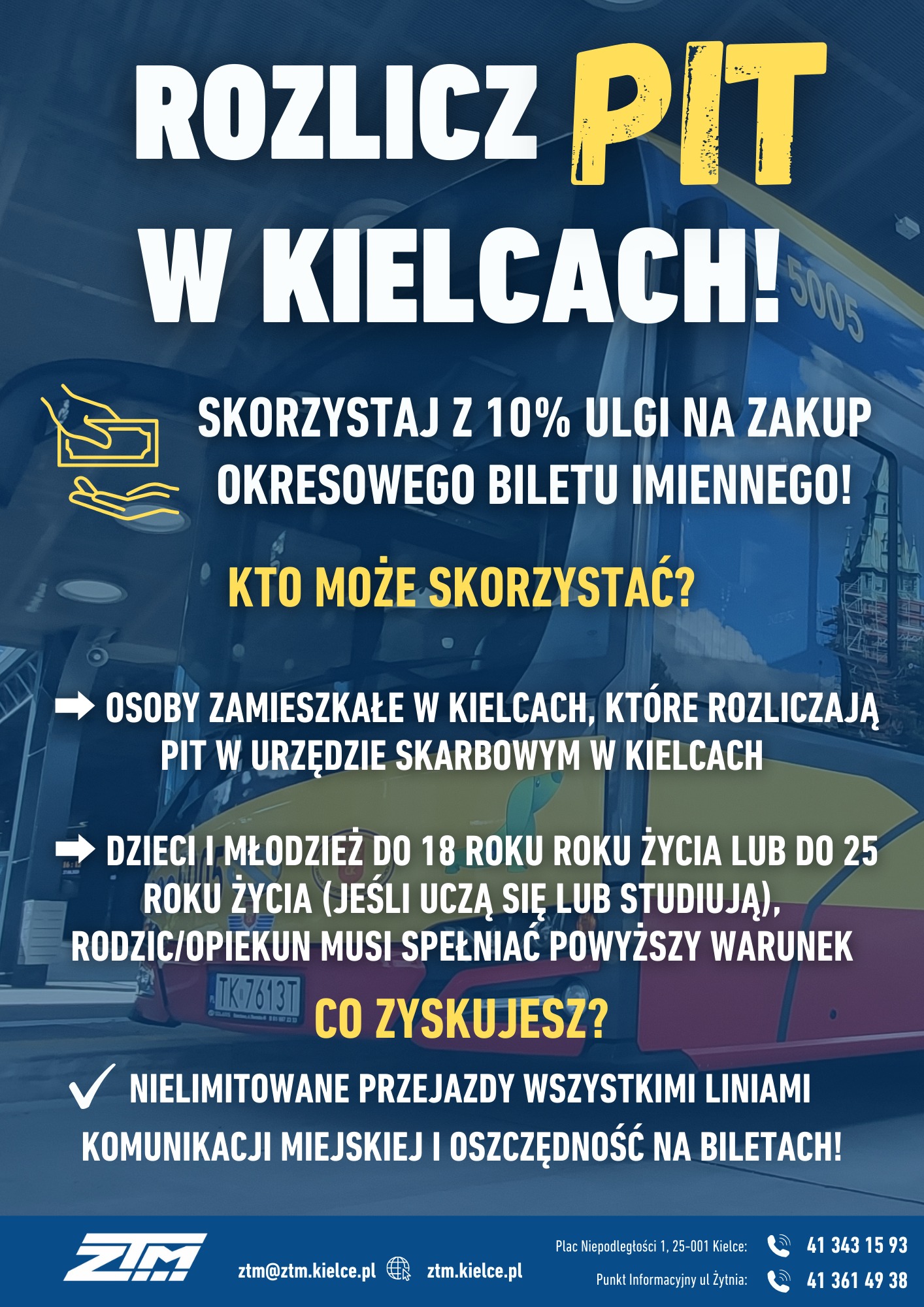 W dniu 8 grudnia 2022r. Pan Prezydent miasta Kielce wydał Zarządzenie nr 468/2022 w sprawie procedury ustalenia uprawnień do zakupu elektronicznych imiennych biletów okresowych. Procedura została zmieniona Zarządzeniem nr 12/2023 w dnia 12 stycznia 2023 roku
