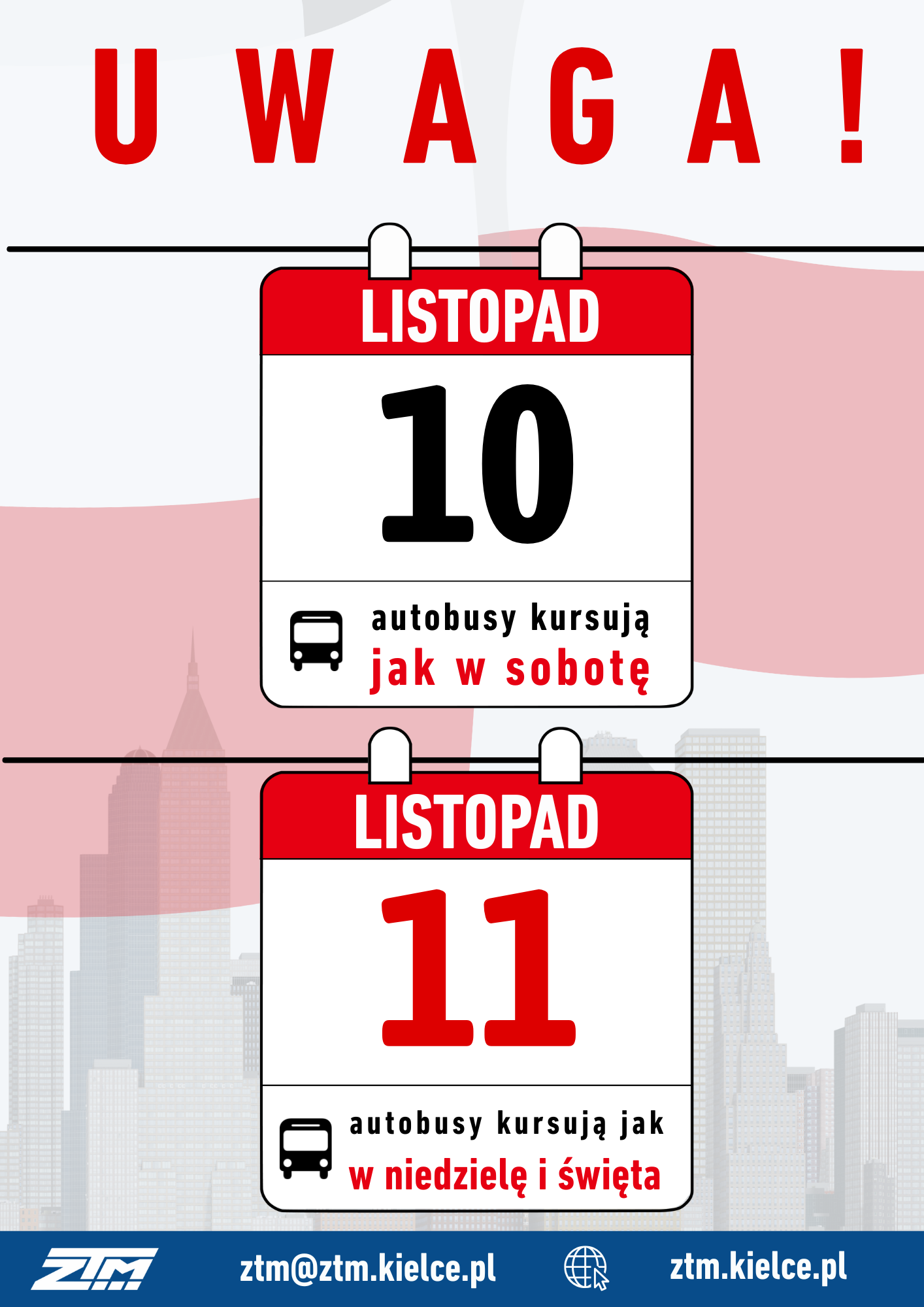 Zarząd Transportu Miejskiego w Kielcach informuje, że w poniedziałek 10 listopada 2025 roku autobusy komunikacji miejskiej kursują jak w SOBOTĘ, natomiast we wtorek 11 listopada 2025 roku w Narodowe Święto Niepodległości jak w NIEDZIELĘ.
