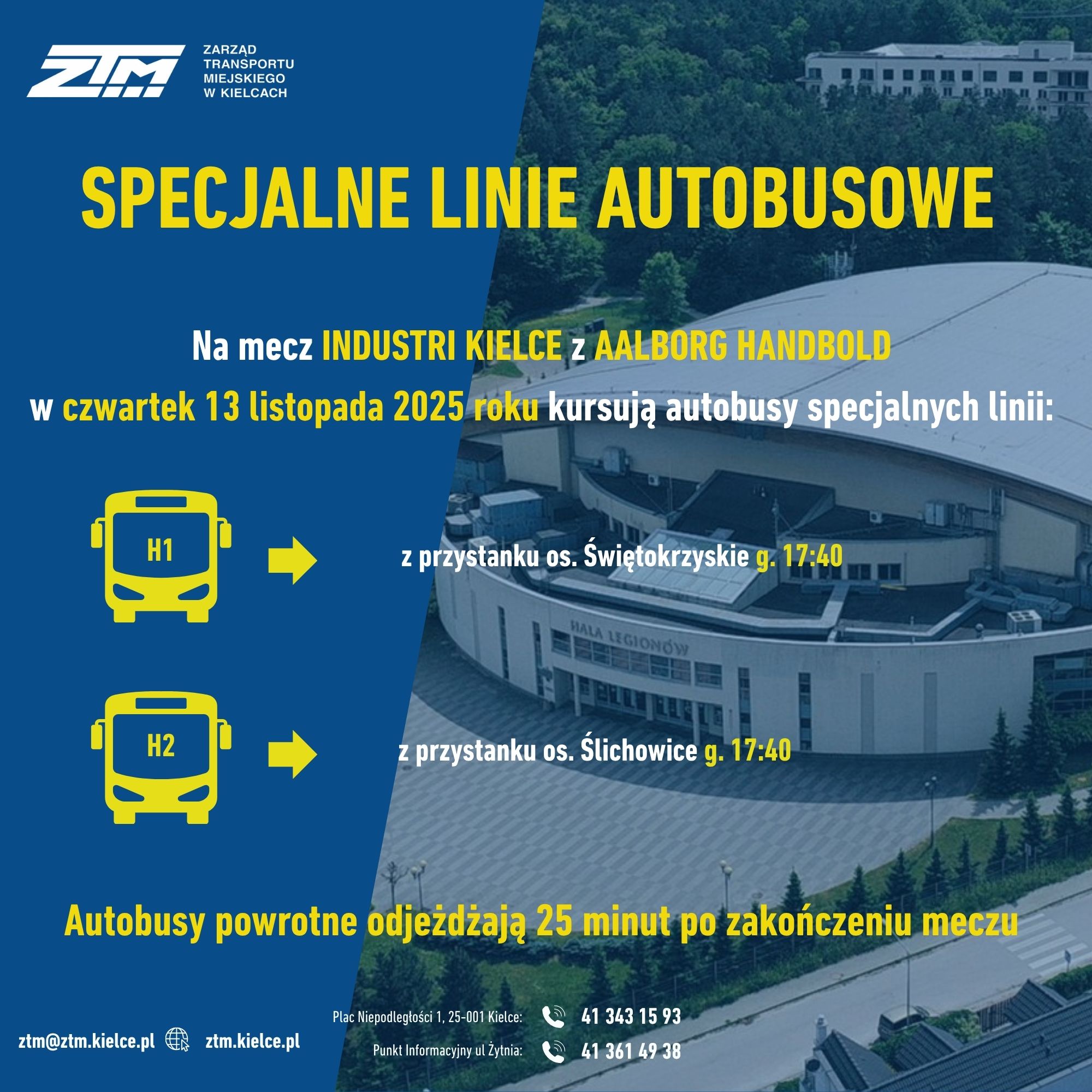 W czwartek 13 listopada 2025 roku na mecz Industrii Kielce z Aalborg Handbold zostają uruchomione dwie specjalne linie H1 i H2. Autobusy będę kursowały przed meczem (przyjazd na przystanek Szczepaniaka przychodnia) jak również po jego zakończeniu (odjazd 25 minut po zakończeniu meczu) zapewniając dojazd jak i powrót ze sportowego wydarzenia.